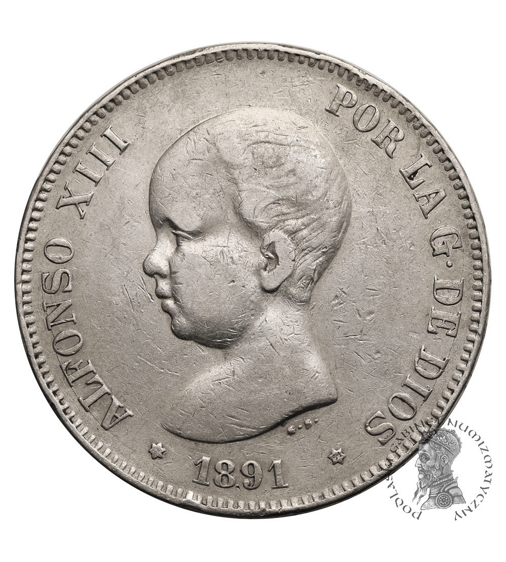Spain, Alfonso XIII (1886-1931). 5 Pesetas 1891, KM 689, Silver 37 mm, weight 24,8 g. .900, Condition VF, minor damage to the edge, gray patina