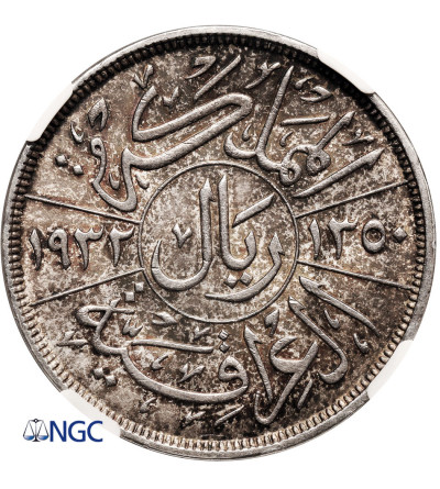 Irak, Faisal I 1921-1933 AD. 1 Riyal (200 Fils), AH 1350 / 1932 AD, KM 101, srebro 34 mm, waga 20,0 g. .500, stan zachowania NGC MS 62, piękna, patyna, połysk, menniczy egzemplarz, rzadki w takim stanie zachowania